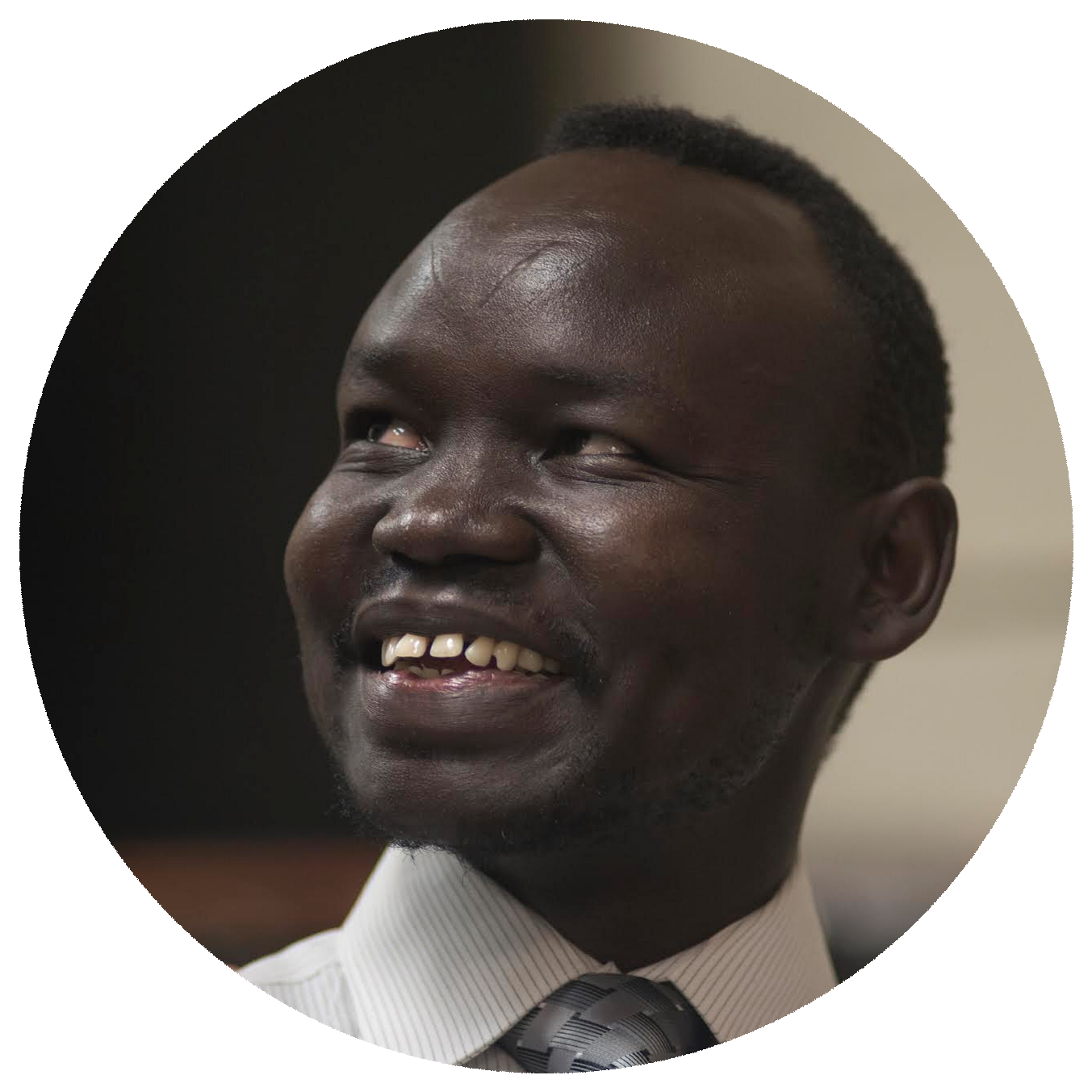 I was born in Piol Village, Jonglei State, in Southern Sudan. In 1987, I was forced to flee my homeland at the age of six without parents as helicopter gunfire and aerial bombs ripped apart my village along the White Nile River. I took refuge in Ethiopia and Kenya before making the US my new home in 2001. I started schooling from under the tree in refugee camps to learn English, arithmetic, science, and Kiswahili. I developed art skills on my own from memory and imagination using dirt, walls, and cardboard as my surfaces. I used charcoal, chalk, and colored pencil plus other pigment dirt due to lack of materials. I started with stick figures that depicted the exodus of the Sudanese children. I continued work with African scenery, especially native African animals and landscape, and science illustrations for disease awareness in the camp. I devoted more time to art in Nashville, Tennessee, where I had a minimum wage job to buy the materials. I painted particularly with acrylic color on paper, canvas, river rock, and other available surfaces.